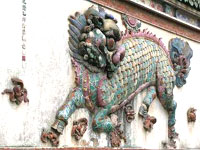 “麒麟壁”原建于泉州府城隍庙(参见《泉州寺庙·城隍庙·泉州府城隍庙》)前,于清·乾隆三十四年(1769年)那次“修山门,移水沟”修萁时所建,1974年移进开元寺保护。 “麒麟壁”用交趾琉璃陶镶嵌一只大型神兽。关于这只神兽,有两种解说: 一说是麒麟,龙首牛尾、麟身偶蹄、步云回首顾盼状,下配嵌砖雕的 |