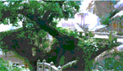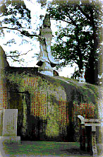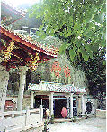 在寺之左侧,有夜月洞,叫伏虎洞,洞顶刻“稜层”“啸云”四字,洞中伏着一只泥塑老虎。每年中秋,月光照到泥虎头上,只见它双目炯炯,眈眈注视洞外,令人望而生畏。左侧有一石门,门外盘石夹峙,称“夹天径”,即“一线天”。从夹径可攀上“虎牙洞”,势若猛虎张口,洞口绕以石栏,与虎牙无异,又有古榕攀绕“虎牙”,紧贴“虎颔”,而气根飘垂,恰似虎髯。虎口上龈刻着“划然长啸”、“凌空一漱”八字,下龈蹲着两只石虎,造形生动。