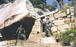 在鼓浪屿日光岩半山腰。从石巷上进,便是龙头山寨,这是郑成功在厦门最早建立的屯兵山寨,现只存一个石砌寨门。我国教育家蔡元培先生,曾题诗一首:“叱咤天风镇海涛,指挥若定阵云高,虫沙猿鹤有时尽,正气觥觥不可淘”。寨门右侧有“宛在亭”,“宛在亭”下有一巨石,上端平坦,高15米,宽6米,坐南朝北,与厦门隔江相望。巨石下方刻有“闽海雄风”四字,苍劲有力,右上方有“郑延平水操台故址”字样;另一石刻郑成功五绝诗一首:“礼乐依冠第,文章 |