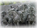 《闽海雄风》长13.5米,高4.7米,重18吨,是国内最大的一组历史人物青铜群雕。群雕前景突出郑成功横刀立马率部将马信、陈泽、杨朝栋、陈广等绕勇善战的雄姿,背景是浩浩荡荡的藤牌军。人物造型层次分明、个性鲜明,栩栩如生。使人感觉到战旗飘舞、铁马奔突、刀盾撞击,士气旺盛,气势恢宏。浮雕屏两侧 |