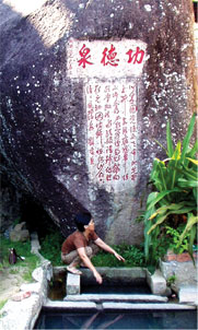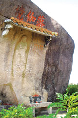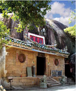 海月岩,在漳浦县梁山东麓,宋时辟石洞为佛台,背山面海,每当月华初上,必照佛顶,故名。山上奇石嶙峋,千姿百态,而岩寺则就天然石洞建成。洞顶是一块巨石,长31米,宽13米,所以民谣说“海月岩,好风景,石头作厝顶”。洞门匾额书“鹫岭云门”。寺里石壁上雕刻一尊如来佛,面向东海。据说,每年大寒前后,旭日初升之时,日光直射岩下羊角潭水,返照寺内,殿前金光灿烂,故谓之“日出窥禅”。每年中秋之夜月光又从羊角潭中折射,返照佛堂正中如来佛的胸前,银光辉映四壁,故曰“月照禅心”。 恰如大雄宝殿一副对联所云:“海气凝云,云气结成罗汉相;月光映水,水光反照菩提心。” 寺前旷埕,凭栏远眺,海天辽阔,烟波浩渺,甚为壮观。寺南岩壁上刻有“无住境”三个大字。海中有石矾塔,屹立于漳江入海口的波涛涌没间。寺北有老人峰,俗称“海外金刚”,高耸于云雾缥缈之际,风光绮丽。附近摩崖石刻60多处,大小佛像108尊。其中“落伽境”,在一块石笋上精雕细刻出一尊观世音佛像,赤足履地,栩栩如生,像要从石壁中走出归回南海似的,真可谓巧夺天工。“别有天”古树蓊蔚,幽静凉爽,素称洞天胜景。 |