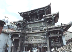 边长0.58米,前后小方柱边长0.27米。正楼4坡顶,顶部檐下正中置镂雕一龙衔顶、双龙盘边、祥云托底的竖匾,匾上直书“御书”二字。其下是两面分勒康熙所赐御书“勇壮简易”和“所向无前”正匾。正匾以下,用梁坊隔为3层:中层两边各雕一站立人物,中间阴刻楷书诰布;上下层各嵌3块雕有抚琴、游园、出行等图的镂空双面雕花版。再下是大阑额,其上浮雕张口双龙和云纹。正楼两侧是各为两层的边楼,各楼均设4根小柱支撑3面出檐的楼盖,柱间俱嵌有镂雕花版。 (节选自漳州今古网) 【返回】 |