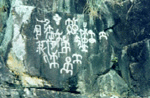 远,风吹日晒,苔生岩剥,纹道漫漶,不易辨认,民间传为神仙的笔迹,故有称“仙字”、“仙书”、“仙篆”,地名遂称为“仙字潭”了。 仙字潭摩崖石刻共有6处13组50多个符号,其中一处为汉字:“营头至九龙山南安县界 ” 。自西向东,面积约高6米,宽30余米,大约200平方米。第一组,面积高0.76米,宽.24米 ;第二组,面积高1.06米,宽0.50米;第三组,面积高0.14米,宽.0.14米;第四组,面积 高0.16米,宽0.18米;第五组面积高0.30米,宽0.22米;第六组,面积高0.34米,宽0.31米 ;第七组,面积高0.50米,宽0.60米;第八组,面积高0.57米,宽0.33米;第九组,面积高 1.00米,宽0.38米;第十组,面积高0.26米,宽0.28米;第十一组,面积高0.34米,宽0.31 米;第十二组,面积高0.4米,宽.1.17米;第十三组,面积高1.30米,宽1.62米。这些或画或字的意义,千百年来难以索解。 仙字潭岩画,早在1000多年前就被发现。据宋《太平广记》引张读《宣室志》云:“泉州之南,有山焉,峻起壁立,下有潭,水深不可测,周十余亩……石壁之上有凿成文字一十九言,字势甚古,郡中士庶,无能知者。”有人持仙字的拓本,请教在洛阳的韩愈,经韩潜心精研后,破译道:“似上帝责蛟螭之辞”。但不知有何根据。 张读,字圣用,深州陆泽人。他是张荐的孙子,十九岁中进士,僖宗时任吏部侍郎,终于尚书左丞。他又是写《玄怪录》的牛僧儒的外孙,受外公影响,而撰《宣室志》。宣室是汉文帝召贾谊问鬼神的地方,用以名书,表示本书所记,都是鬼神灵异的事迹。可见仙字潭在晚唐时,已被发现并记述于史籍了。 到了近代,岭南大学黄仲琴教授于1915年率先深入到荆棘丛生的仙字潭作实地调查,《汰溪古文》就岩画的位置、形态、结构第一次作了科学描述,可惜黄教授仅在潭边遥观,仅发现10个图象,记述过于精略。至1957年8月,省文管会林钊、曾凡再次深入现场调查,所发现图象比以前增多,共分五组。他们较系统较全面地介绍仙字潭岩画实测资料,包括岩画大小尺寸,形态结构,并附照片、拓片,为以后科学研究提供了确切可靠的资料,从而引起学术界的重视。迄至1988年,在华安举办“漳州地区摩崖石刻学术讨论会”,掀起了对仙字潭摩崖石刻研究热潮,在专家中展开了一场“字乎?画乎?“的大争论。结果,众说纷纭,莫衷一是。持“文字说”的专家认为,崖刻是文字的雏形,基本具备文字的特征。也有学者认为,从图象造型看,仙字潭石刻是书画同源的一个标本,是由图向文字过渡演变中的一种象形艺术杰作,因此,从某种角度来看,它的意义并不亚于甲骨文、金文的价值。于是,他们就用甲骨金文进行套译,译为“昱馘夷俘越,□吴王昱,吴战越,战番□番。”或译为“□(部落)二师(征)伐(敌)酋(首)俘伏(敌)酋(首)。所译内容虽略有不同,但都认为是氏族部落战争的记功石刻。 多数学者认为,用甲骨金文套译岩画,本身就很值得商榷,所破译的内容也难以自圆其说。史前时期,何来“吴战越、战番”征战史呢?独有陈兆复、盖山林两位学者持异论,向“文字说”提出挑战,明确提出崖刻确是“崖画”,它是经过作者艺术夸张,浓缩,符号化了的原始图画。例如:图象最多,面积最大,画面1.30×1.62米,是由众多的人体形组成的群。舞娱神图。画面最高处是一个奇特的图象,刻画与众不同,圆点的头下,双臂平伸,两个圆点应为乳房,下肢分开夹一圆点,似乎表示女性的生殖器。应该表示是母系氏族的图腾——神,左下方是两个大腹肚的人形,似乎是酋长,右下方则是手持飘带或其他法器的人形,没有大腹肚,大概是男性。其他大多舞者双臂平伸,肘部下垂,双腿分开作蹲踞状,臀下有尾饰,个别舞者作倒立状。其基本内容是表现氏族部落祭祀娱神的舞蹈场面。 又如,另一幅画,上方为一个人体形舞者,左臂上举,右臂高扬,双腿叉开,作蹲踞状,臀部下有尾饰。腰部似插有匕首,右臂空间似有水珠滴落。意象是巫师祈雨。下方为两个人体形舞者,另一个是侧身舞象,代表氏族祈雨人。更下方有两个兽面形,只有眉、眼、口、无头部轮廓,似为牺牲或人之首级。 如是看来,各组岩画,都有其特定内涵,或为祭祀祖先,或为祈神降雨,或为纪念某一酋长或英雄。作一图画看便不难理解其内容了。这是古代先民们经过艺术夸张,浓缩并符号化了的一种原始岩画。至于是属于那个民族,产生于那个年代,也是说法纷纭,有待研究了。 (资料来源:漳州掌故大全 作者:陈存洗 戴 岳) |